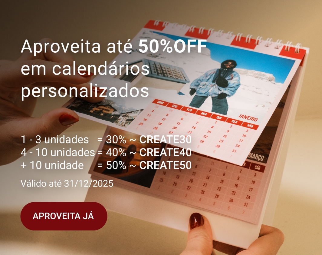 Campanha de desconto válida de 14/10/25 a 31/12/25. Aplica-se a todos os calendário com os seguintes descontos mediante submissão de código de desconto: