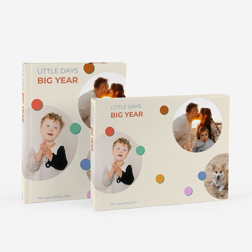 Explora a nossa variedade de formatos de álbuns, que incluem várias opções, desde modelos compactos e práticos, ideais para transportar, até álbuns mais amplos e detalhados, perfeitos para incluir todas as tuas memórias. É claro que cada formato foi pensado para se adaptar às tuas necessidades e ao teu estilo. Criar um álbum de fotos do ano é a forma ideal de transformar as tuas fotografias em recordações eternas e únicas.